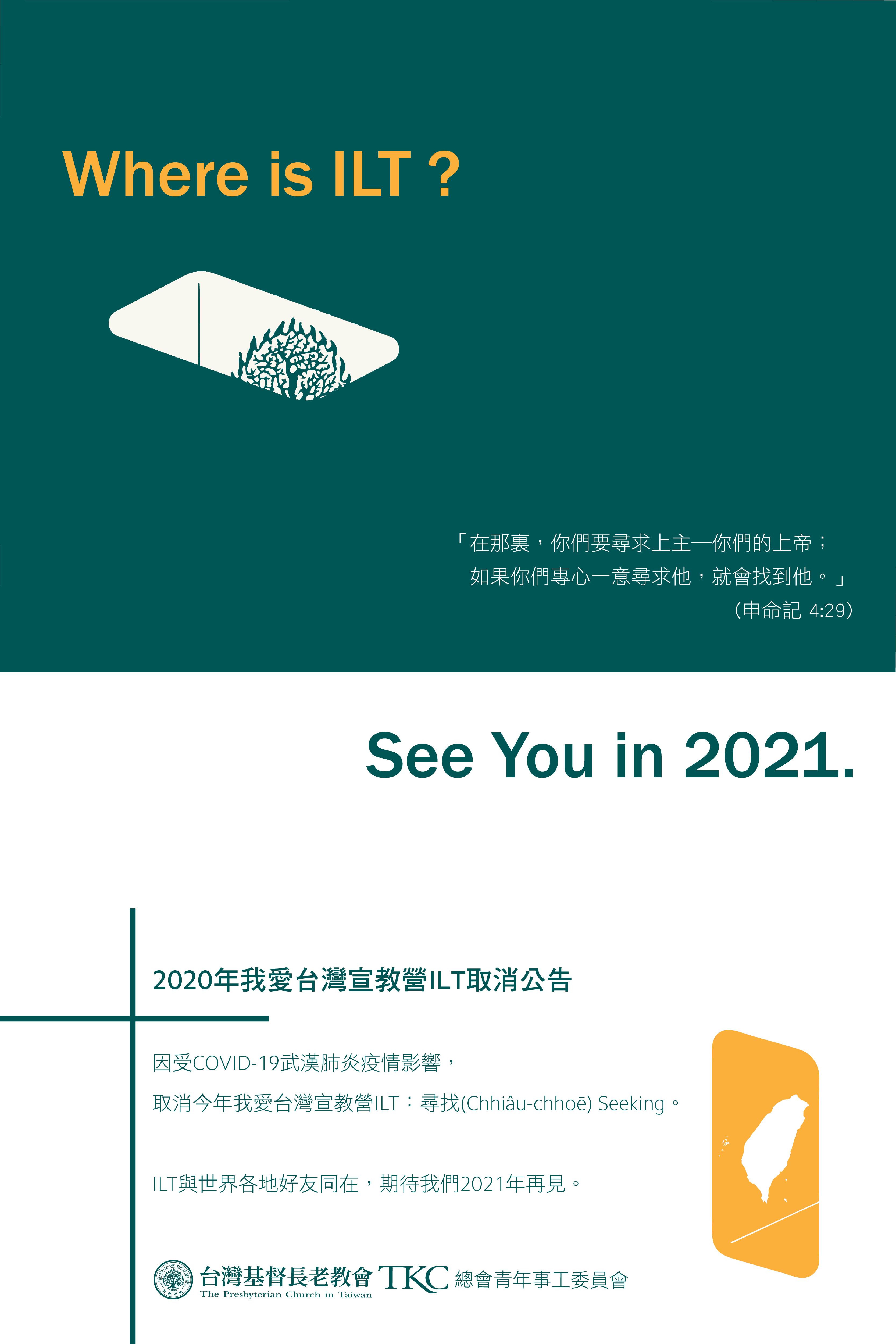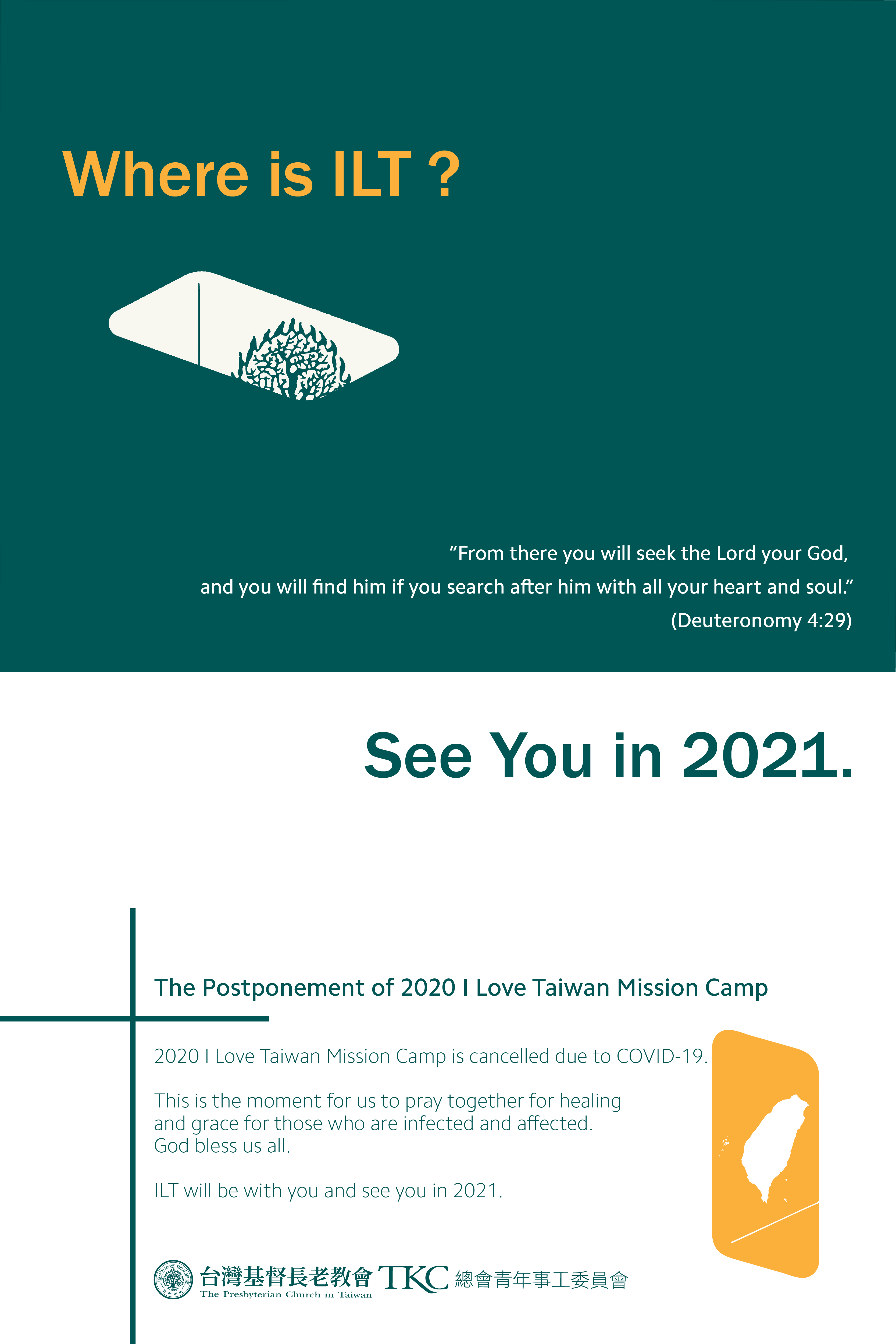 2020 I Love Taiwan Mission Camp is cancelled due to COVID-19. “From there you will seek the Lord your God, and you will find him if you search after him with all your heart and soul.” (Deuteronomy 4:29) This is the moment for us to pray together for healing and grace for those who are infected and affected. God bless us all. ILT will be with you and see you in 2021. |