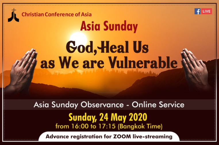 Asia Sunday 2020 will be observed with a focus on the theme, ‘God, Heal Us as We are Vulnerable’. A unique virtual worship service will be organised by the Christian Conference of Asia (CCA) on 24 May 2020 from 16:00–17:15 (4 PM to 5:15 PM) Bangkok (Thailand) time. Ecclesiastical and ecumenical leaders from the CCA’s constituencies across Asia will lead this one-of-a-kind virtual prayer service. Asia Sunday is observed by the member churches and councils of the CCA annually on the Sunday before Pentecost. This year, Asia Sunday falls on 24 May 2020. Speaking of the timeliness and relevance of the Asia Sunday 2020 theme, Dr Mathews George Chunakara, the General Secretary of the CCA had earlier stated, “As the global COVID-19 pandemic ravages the world, the CCA has decided to focus this year’s Asia Sunday theme on ‘God, Heal Us as We are Vulnerable’. The crucial conditions which we are currently collectively undergoing serve as a reminder for humankind to reflect on the fragility of human life and the ultimate vulnerability of the entire cosmos. Our world needs prayers, cure, and healing especially amidst this COVID-19 crisis.” The registration for direct participation in the virtual prayer service which will be conducted via Zoom is now open. Please use this link to register: https://forms.gle/md82sXWzYdH8Z44y6 Additional technical details will be sent by email to all registered participants. Those who will not be able to obtain an advanced registration can join the service through Facebook live-streaming on the CCA’s Facebook page: www.facebook.com/ChristianConferenceofAsia Source⇒ CCA |