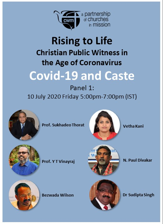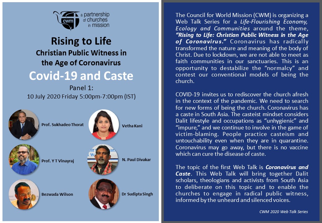 Dear Esteemed Partners, Warm greetings from the Council for World Mission (CWM) Global office in Singapore. We hope that you are doing well. We would like to invite you to the CWM’s Web Talk Series for a Life-Flourishing Economy, Ecology and Communities around the theme, Rising to Life: Christian Public Witness in the Age of Coronavirus. The first web talk is on Coronavirus and Caste to be held on 10 July 2020 (Friday), 5:00-7:00pm (IST) via Zoom. Please find below (and attached) the copy of e-brochure, concept paper and registration link for your use. Click here to register now. You will receive a Zoom link when your registration is accepted. Or you can use this URL link to access the registration form: https://forms.gle/tXVcVqkZevGVq7UP7 Please feel free to disseminate this information to all those who might be interested. Thank you. Best regards, SUDIPTA SINGH Mission Secretary Source► CWM |