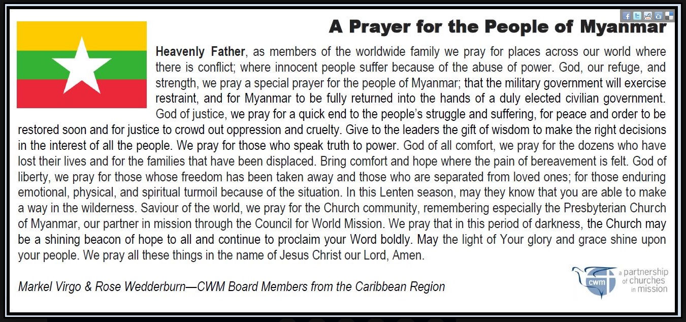 Following the worsening developments in Myanmar, Council of World Mission (CWM), Presbyterian Church in Taiwan (PCT) and Presbyterian Church of Aotearoa New Zealand (PCANZ) have released separate statements of solidarity with the Presbyterian Church of Myanmar (PCM). CWM General Secretary Dr Collin Cowan had reached out to PCM General Secretary Rev Ram Thanga to express deep concern and CWM’s commitment to mutual accompaniment with the Church and people of Myanmar. Rev Ram Thanga had described the situation as “the people’s struggle for freedom from the military”, requesting prayers “for the military government to exercise restraint towards the people”, and “for Myanmar to be fully returned into the hands of a civilian and duly elected government”. PCT also joined its voice with PCM for duly elected leaders to be released from house arrest, stating that the national crisis during the pandemic is creating “major stress, anguish and trauma to the Myanmar people, as well as the crisis surrounding the Rohingya minority”.