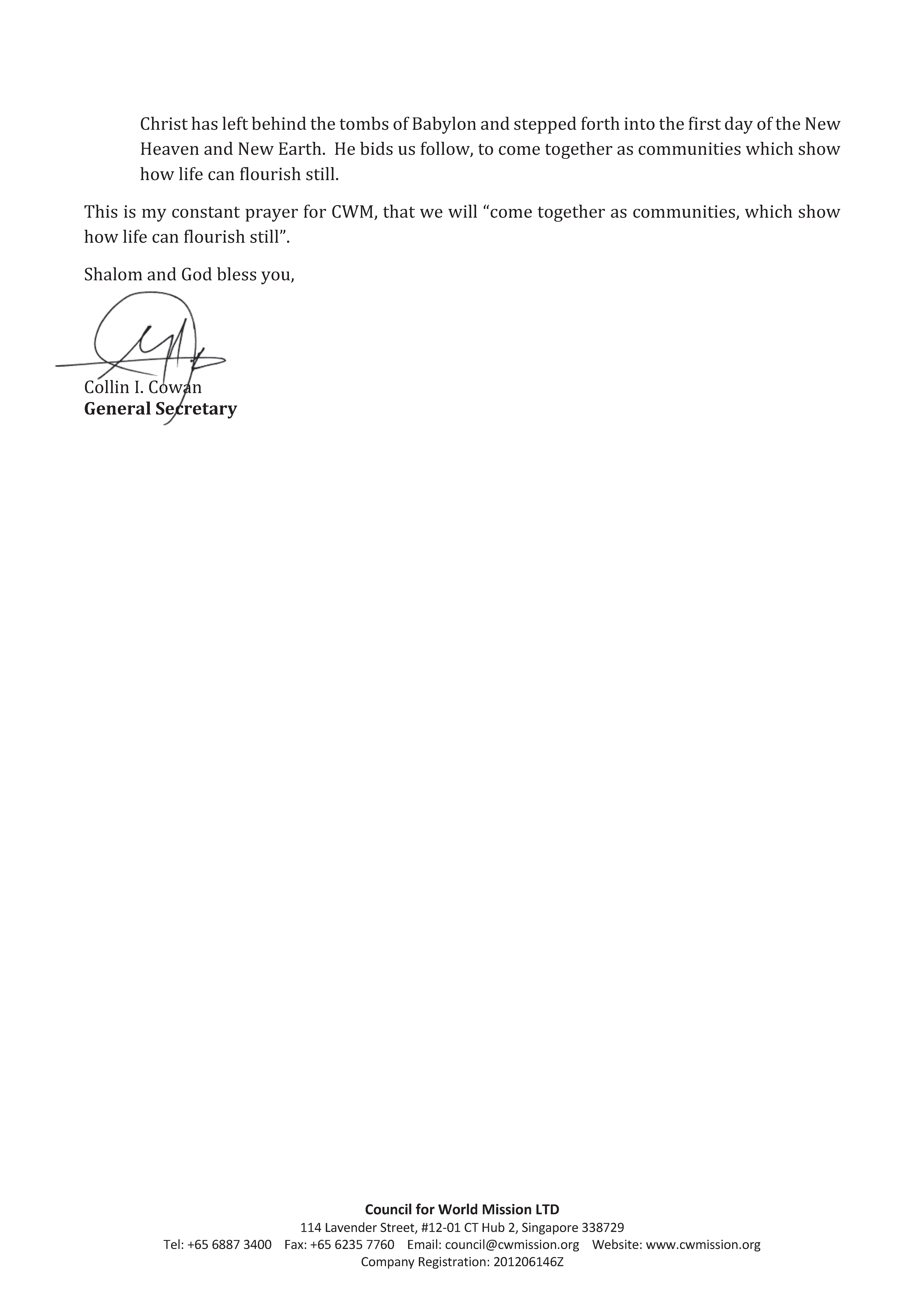 To: General Secretaries CWM Member Churches Dear colleagues, friends and well-wishers in ministry: Greetings and blessings to you and yours in the name of our Lord, the liberator from Nazareth. Today, 16 July 2021, marks my last official day in office. As of now my successor, Rev Dr Jooseop Keum, takes full charge of the operation; and whilst I am still around for a while longer, I am largely in the background, supporting him in the transition and handover protocols. This transitional arrangement continues through to 31 July. Thereafter, I will proceed on 3 months’ sabbatical in preparation for my journey back home to Jamaica, where I will continue the discernment regarding the next phase of my ministry. It seems only wise and prudent that this next phase of the journey should begin with time for rest, reflection and discernment. This letter comes as my expression of gratitude to you for the part you have played in helping me to be the leader of this great organisation over these 11 years as General Secretary. In different circumstances, I have experienced your care, challenge and comfort. You knew just what support was needed in the varying situations that confronted me and you responded with large-hearted generosity. Thank you for your role in this great community of witnesses. Thank you for being kind, even when your kindness hurt; and for being willing to make yourself vulnerable in order to walk with me. I make these expressions of gratitude with profound appreciation for the love and care you have extended to my family as well. As I go, I assure you of my prayers for the continuation of the work begun and for the new path that will be charted under current leadership, led by my successor, Jooseop Keum. The possibilities are endless in the vision for and commitment to “Life-flourishing Communities: Living out God’s Promise of a New Heaven and a New Earth”. To underestimate the paralysing impact of the pandemics that currently plague the world, could lead to catastrophic ends; however, no pandemic, nor any force of evil, is so strong as to thwart God’s purpose to transform the world, restore relationships and build social trust. This is our quest, as we echo the ever-familiar words – “Another world is possible”, indeed, necessary. And like we said in the introduction to the 2020-2029 strategy framework, “By sharing in Jesus’ daring and life-transforming mission, CWM can play its part with others in enabling the emergence of life-flourishing communities, where justice and peace are experienced by all”. This is the other world we dream about and long for. I commend you to God’s gracious keeping and I pray that God will endow you with the courage to do the right, never doubt, never falter. In the CWM Missio Confessionis, we remind ourselves: Christ has left behind the tombs of Babylon and stepped forth into the first day of the New Heaven and New Earth. He bids us follow, to come together as communities which show how life can flourish still. This is my constant prayer for CWM, that we will “come together as communities, which show how life can flourish still”. Shalom and God bless you, Collin I. Cowan General Secretary