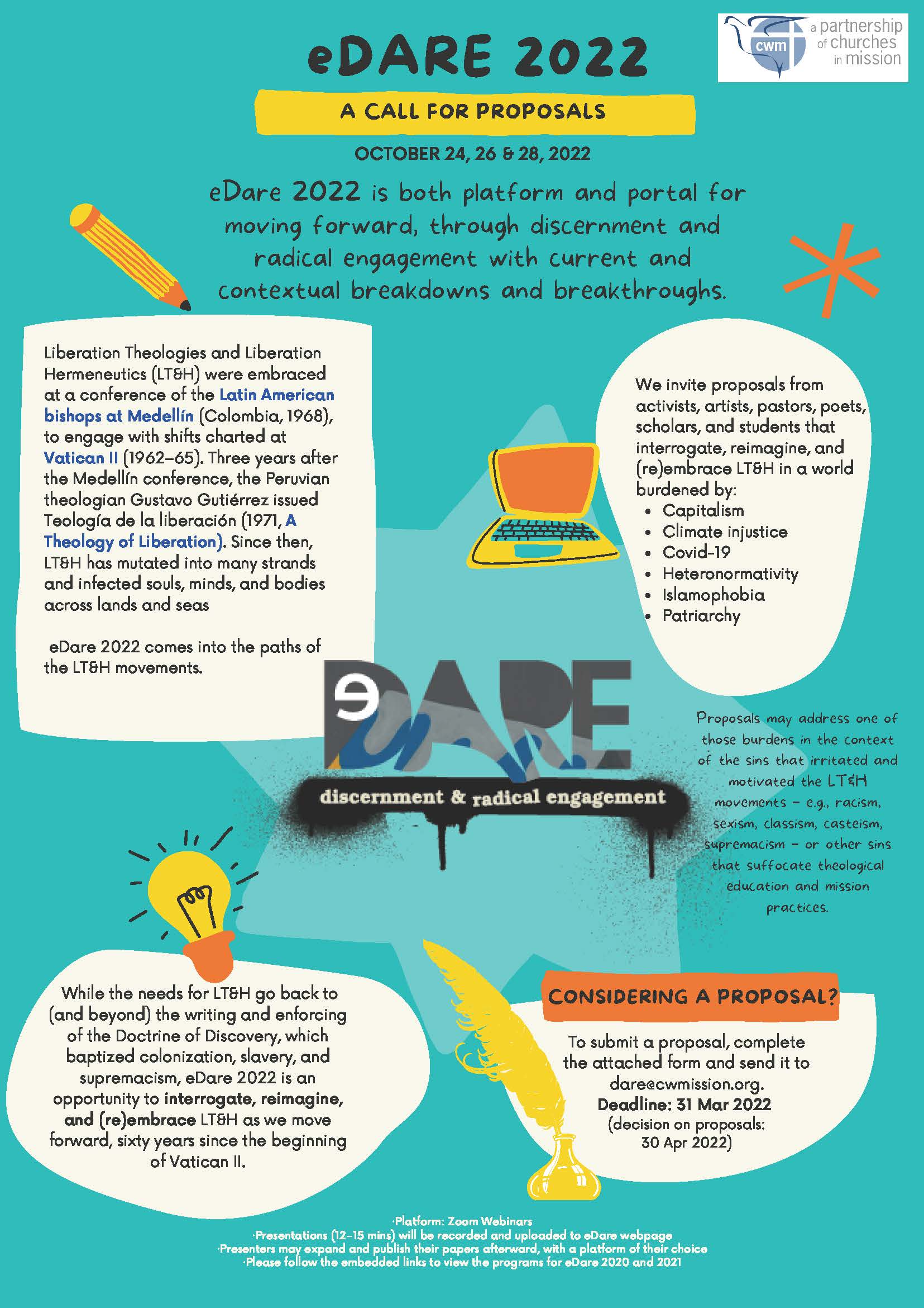 CWM invites your contribution and participation in eDARE 2022. The keyword is liberation: What does liberation look and feel like? Liberation FOR whom and for what? Liberation FROM whom and what (else)? How might you DARE our communities and churches, theologies and missions, to activate those forms of liberation? eDARE 2022 is a platform and portal for discernment and radical engagement (DARE) with such questions, with their underlying longings and creative possibilities. To participate, please see attached (1) the call for proposals and (2) a form for submission of proposals. Let us DARE to enable (alternative) liberation. Download the proposal form (Word format) here. Download the proposal form (PDF format) here. Send completed form to dare@cwmission.org on or before 31st March 2022.