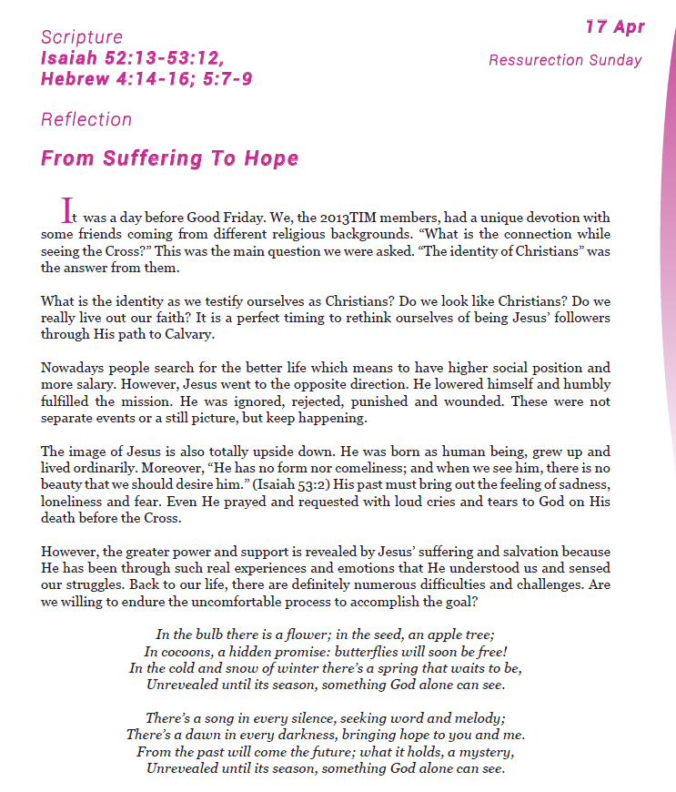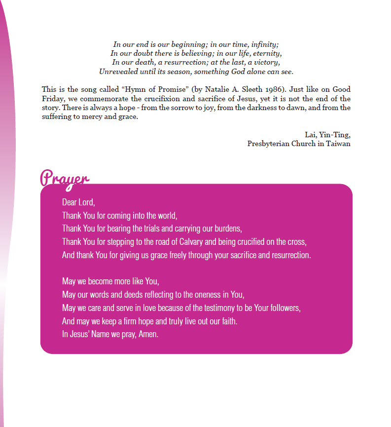 Dear Sisters and Brothers in Christ Jesus, Greetings of Peace and Joy from the Council for World Mission (CWM) in the name of our Lord Jesus Christ. As we enter the new year, we are still grappling with various challenges and uncertainties caused by the ongoing Covid-19 global pandemic. The Pandemic also unveiled various social, political, and economic inequalities, and we continue to struggle with the structures that create these inequalities. Nevertheless, it is my prayer that this year be kind to us, allowing us to meet one another and worship together. As people of God and as we walk by faith, we continue to hope that the power of God’s resurrection will provide us strength to overcome all these challenges. I am pleased to present to you the ‘Sundays with CWM,’ a weekly devotional booklet intended to assist you as a resource to use during your personal, family or congregational gatherings to worship God. In the context of CWM celebrating 40 years of Training in Mission (TIM) programme, this year’s devotional booklet is a compilation of meditations written by the former TIM participants, most of whom are upcoming young leaders of our member churches. As the former TIM participants, the contributors in this booklet share their faith, various missional experiences, and aspirations, I believe these meditations will help rekindle our faith and trust in the Lord. They provide us new insights and prayers for our weekly worship gatherings as we move towards transforming our families and congregations into life flourishing communities as part of the theme of our strategic framework, ‘Rise to Life: Confessing witness to life-flourishing communities.’ Keeping the ongoing pandemic and the challenges of printing and distributing the booklets in mind, we proceed with the e-booklets instead of the printed version. I would like to thank all the contributors of weekly devotions as well as our CWM staff for their commitment and hard work in bringing these devotional booklets available to all of us. Wish you all a blessed and joy-filled year 2022. Rev. Dr Jooseop Keum CWM General Secretary Click here to download Sundays with CWM 2022 (Apr-Jun).