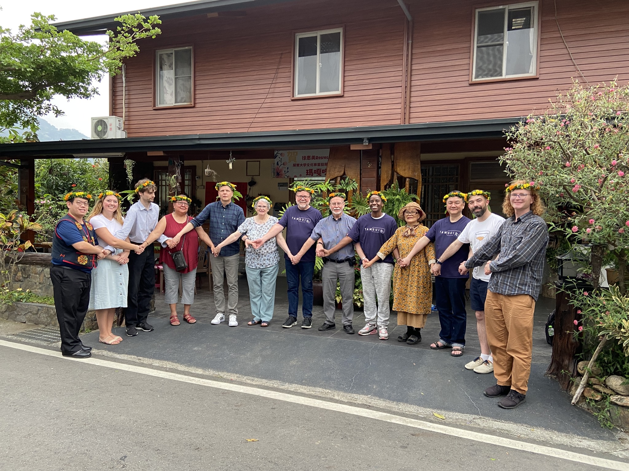 The delegation from The Presbyterian Church in Canada after learning how to make flower garlands in a rural village. (Photo Credit: PCT ECU Office) My experience on the moderator’s trip to Taiwan My name had been put forward by the Vancouver School of Theology for me to become a member of the trip that the moderator of The Presbyterian Church in Canada takes each year. In April, the Rev. Dr. Robert (Bob) Faris was bringing a delegation from across Canada to Taiwan. I’d been looking forward to the trip for weeks. “Maybe it will help with your discernment,” my professor had said. I’m studying for a Master of Divinity, the degree to become a minister, but I’m not sure what I’ll do with it. Upon arrival, we drove through suburbs into bustling Taipei, where lush green trees framed highways and industrial buildings. A Taiwanese Canadian member of our group, Paul Wu, led us on a visit to a temple wedged between urban buildings. Large red dragons adorned the pillars, and dozens of people gathered in a courtyard had lined up to be smudged with incense or to throw wooden divination blocks. Taipei was calm and humming, dense but organized, with narrow alleys, wide thoroughfares, and motorbikes weaving seamlessly in and out of traffic. Pedestrians filled the sidewalks but never seemed to rush. The sun was hot and humid, 30 degrees in mid- April. When the skies opened up a day later, the motor-bikers had suddenly all donned full-body rain suits, without skipping a beat. The day after our arrival, we attended the General Assembly of the Presbyterian Church in Taiwan, one of the main denominations in the country, founded by Canadian and Scottish missionaries in the 19th century. We sat in a huge hotel conference space, where over 500 people took in the rapid, occasionally heated Mandarin and Taiwanese proceedings. Everything seemed formal and ceremonial, and yet debates were constantly emerging between speakers on the floor and leaders on the stage. I struggled to follow the simultaneous live translation. Proceedings stopped suddenly when a flurry of television news crews scurried in, followed by the Taiwanese vice-president, who gave a speech about choosing democracy and religious pluralism over authoritarianism. “Even if China invades, we have the God of history on our side,” the pastor of one church we visited later said to us. “Pray for Taiwan,” several people said as we left their communities. “Don’t forget us.” On our third day, we visited the Jing-Mei White Terror Memorial Park, which commemorates a period in Taiwan from the late 1940s to early 1990s, when martial law was in place. People were imprisoned without due process, and an atmosphere of secrecy and mistrust hung over the country. The names of people executed by the state were shown on a wall of the former prison. Our guide had spent over 10 years unjustly detained, and he showed us a small, sterile room that he’d barely left for years. He was a jovial man whose demeanour seemed at odds with this grisly history. It was so important for him to come and tell his story there every day, he said. We went around the island on bullet trains, regular trains, by mini bus, even by foot, through low mountains, Indigenous villages and university campuses, seminaries and churches. Bright flowers grew wildly on the sides of dusty roads next to rice fields. Communities everywhere welcomed us, sang, danced and told their stories. One Indigenous group walked us past colourful murals that showed how the community had once been expelled from another region. The people there earned their livelihood by making toys out of bamboo, and showed us how to work with the strong, brittle material. They were hearty, welcoming and relaxed after the formality of General Assembly. They served us rice and seafood wrapped in grape leaves, a sweet and crispy fried meat, fresh melon and guava. We were accompanied on our travels by two guides from the Presbyterian Church in Taiwan: Chi Kang, who introduced us everywhere we went, and Rachel, who made sure none of us got lost. Other members of the moderator’s trip ranged in age from late-20s to retirees, and were selected to represent different aspects of the church’s life and ministry. Every time you took a seat in the bus or the train, you might talk to someone new from the group. I learned about switching careers from day trader to Presbyterian minister, and the challenges of being a gay minister. I heard about a doctoral thesis on open relationships in the church, mission work in Malawi, and advocacy work for people with disabilities. We wanted to be present, in this new place, for these people who knew little of Canada, for whom we would be the example. There is something so heartfelt in that desire to be a good representative. We went to church once, in one village. But we were always in a kind of church, literally or figuratively. To look for God is perhaps sometimes more to look for a type of conversation. “God understands me better in my own language,” one Taiwanese Indigenous man told us. A New Testament scholar at one of the Taiwanese seminaries told me how she ended up in an academic career because of her professor’s suggestion, and said that maybe I would like to pursue a similar path. At one theological college where all the professors met us, dressed formally, sitting behind desks in a conference room, and where they spoke in careful, fluent English, looking calm, collected and reflective, I did feel an affinity. When our moderator asked the president of that theological college about LGBTQIinclusion in the church in Taiwan, it wasn’t possible to tell where the faculty stood on the question. But one woman we met on our journey left an impression I’ll never forget. We met Maelyn at a dinner on a restaurant terrace overlooking a mountain valley near an Indigenous village. There were a few of us Canadians and a few local people at my dinner table. Speaking to us with the h