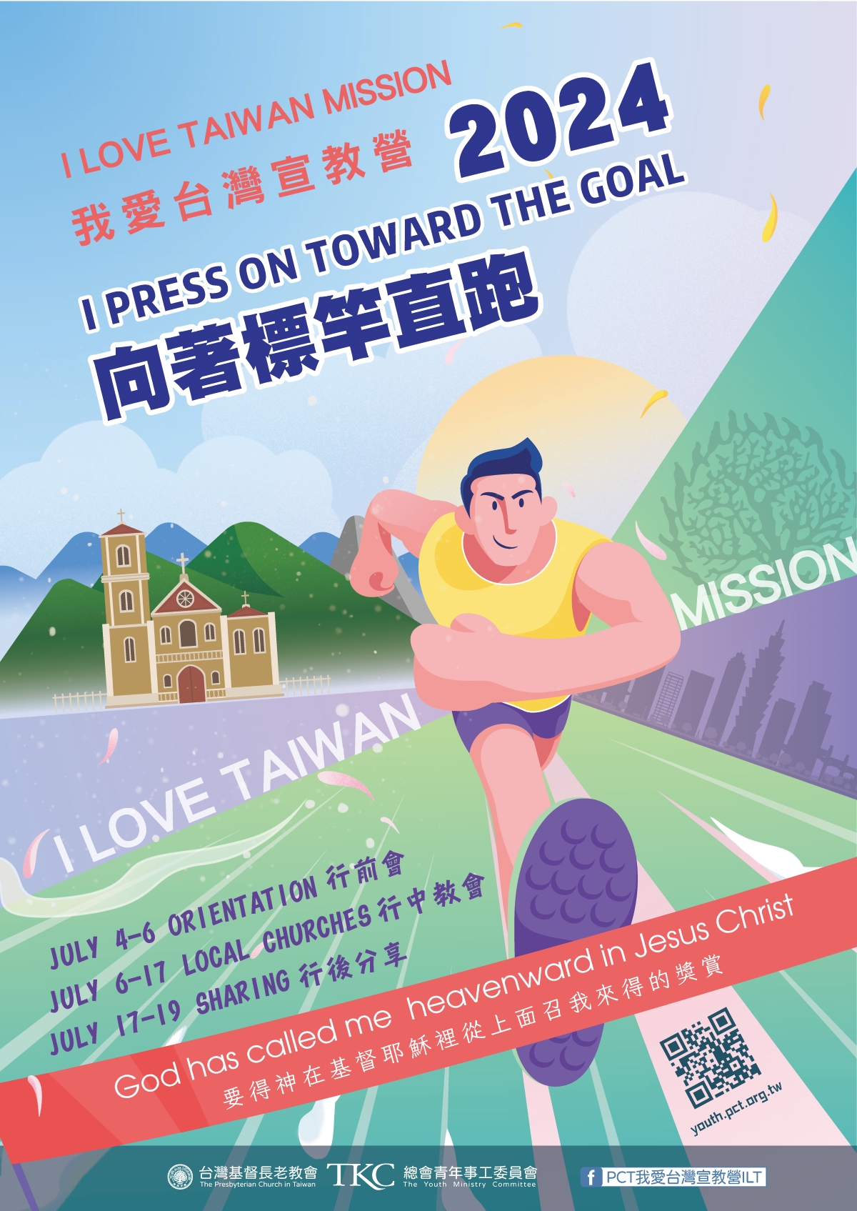 The theme of 2024 I Love Taiwan Mission Camp is I PRESS ON TOWARD THE GOAL. When Apostle Paul was imprisoned, he wrote to the church of Philippi. He emphasized, “Beloved, I do not consider that I have made it my own; but this one thing I do: forgetting what lies behind and straining forward to what lies ahead, I press on toward the goal for the prize of the heavenly call of God in Christ Jesus.” (Philippians 3:13-14) The passage implored congregants to follow Jesus Christ’s heart and practice the faith under harsh persecution. Regardless the volatile situation, we should embrace Christ’s joy and hope and steadfastly follow His step and move forward. This is Paul’s important message, and moreover, foundation of I Love Taiwan Mission Camp.